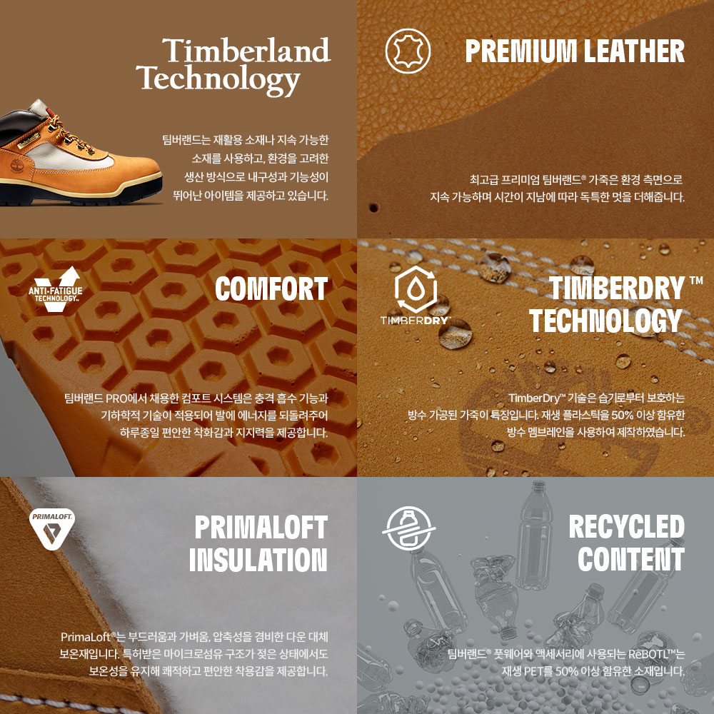 프리미엄 Timberland® 방수 가죽 소재 어퍼와 메시 원단 | LWG(Leather Working Group) 인증 가죽 | 재생 플라스틱을 50% 이상 함유한 ReBOTL™ 소재 안감 | D링 레이스 시스템 | 패딩 칼라 | PrimaLoft® 보온재 200g | 피로 방지 탈착식 풋베드 | 아치 지지용 섬유 유리 섕크 | TimberDry™ 방수 멤브레인 | 고무 러그 아웃솔